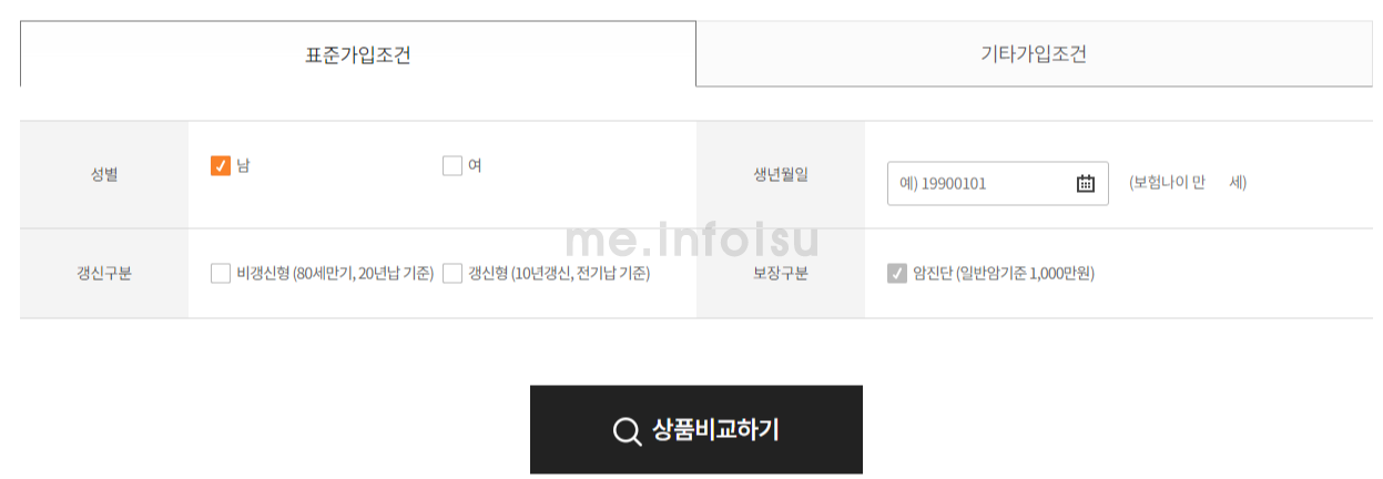 4. 성별, 생년월일, 갱신구분(비갱신형 체크), 보장구분 선택하여 하단의 상품비교하기를 선택합니다.
