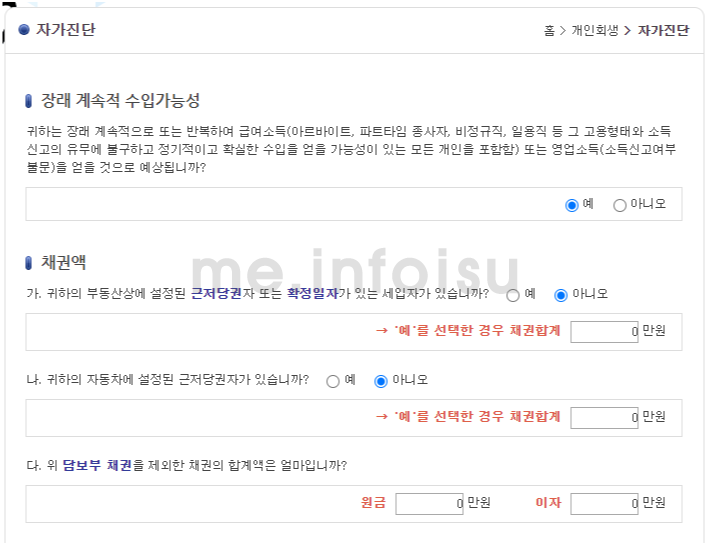 3. 개인회생 신청자격 무료조회를 위하여 자가진단 내용을 정확하게 입력
