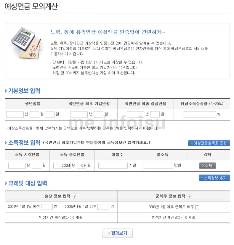 소득과 가입기간을 원하는 대로 입력하여 예상연금액을 확인할 수 있습니다. 로그인 없이 간편하게 알아볼 수 있는 서비스에 해당합니다.