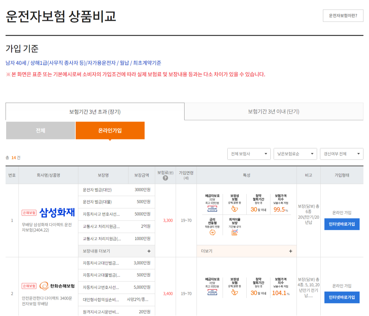 3. 온라인 가입 선택하여 각 상품의 내용 확인