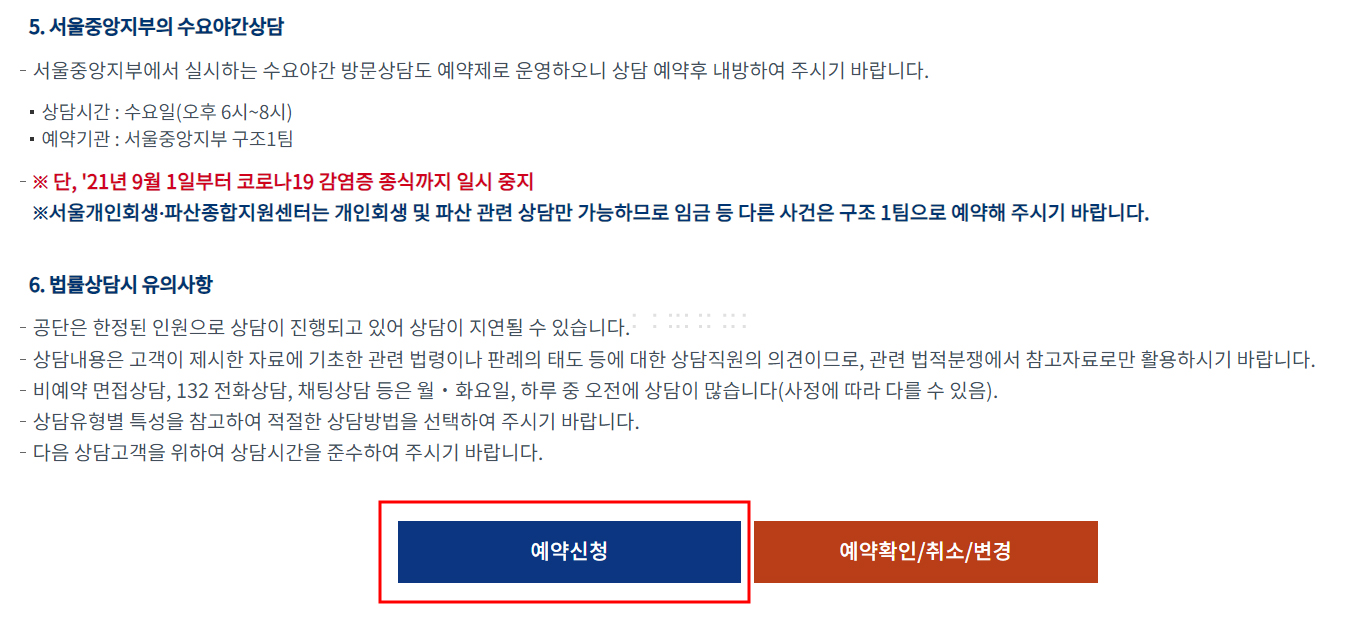 3. 상담시간, 장소, 제한사항 및 예약 관련 내용에 대해서 확인후 예약신청 선택