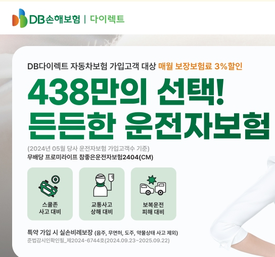 해당 보험은 2024년 5월 운전자보험 가입 고객수 기준으로 438만명이 가입할 만큼 많은 분들께서 선택한 상품 중 하나에 해당합니다. 특히 다이렉트 자동차보험 가입 고객을 대 상으로 매월 보장보험료 3%할인 적용이 이뤄지는 특징이 있습니다.