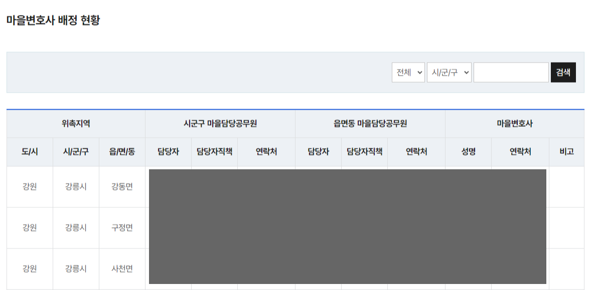 - 현장 상담 : 희장자 및 마을변호사 일정에 따라서 진행될 수 있는데 각 읍, 면, 동사무소를 통해 현장 상담 가능여부를 확인해볼 수 있습니다.