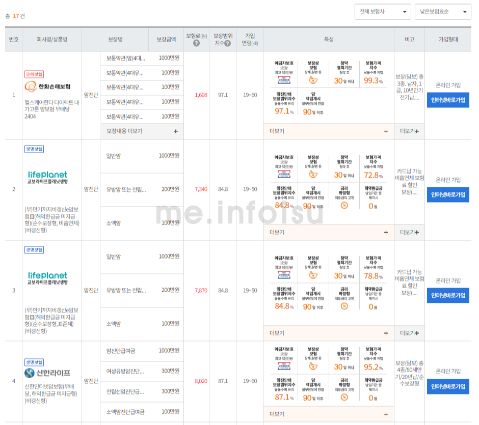 보험사별 상품임름과 보장내용 그리고 보험료 및 가입연령, 보장지수 범위 및 가입형태 등에 대해서 직접 확인하여 비교하시면 됩니다.