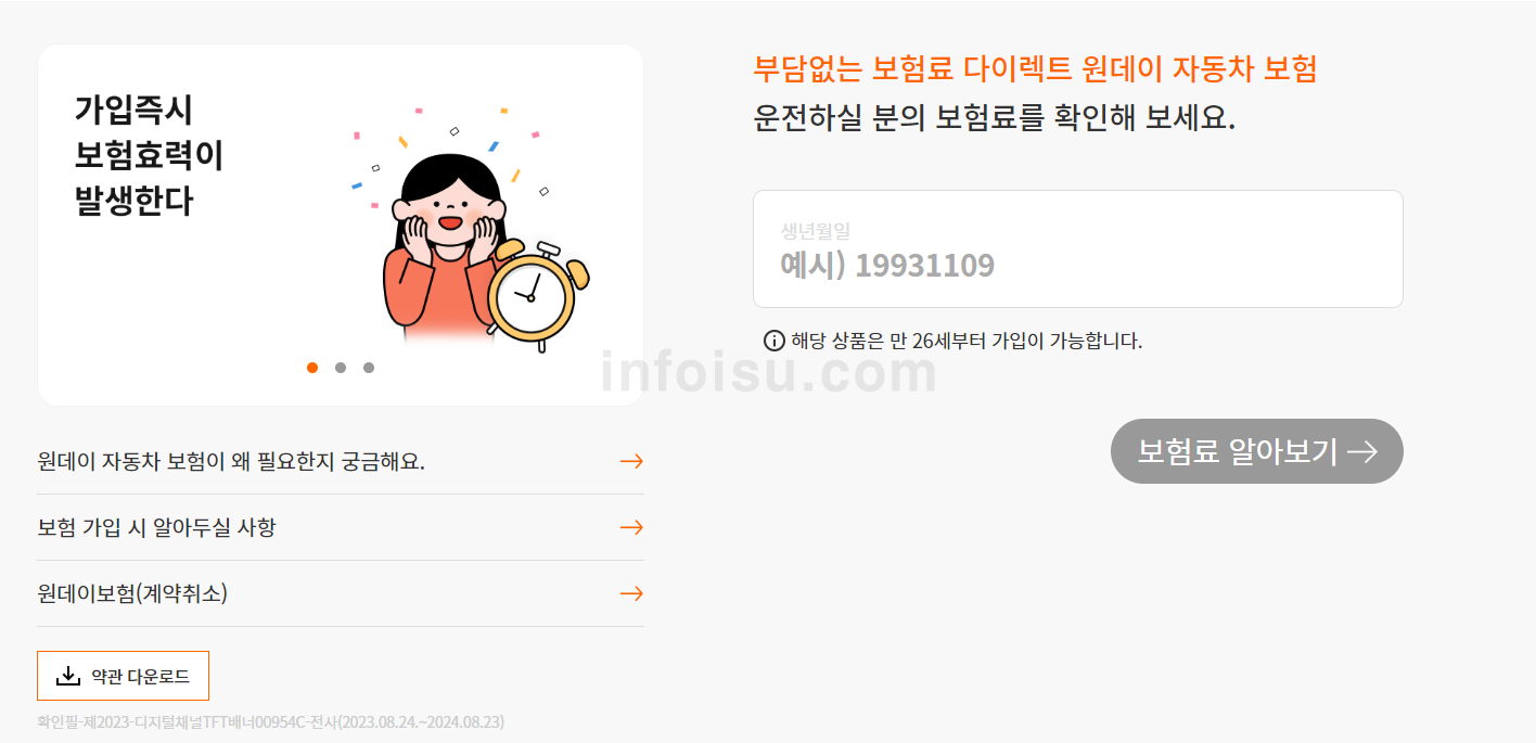 1. 다이렉트 원데이 자동차보험 홈페이지 접속하여 생년월일 입력 후 보험료 알아보기 선택