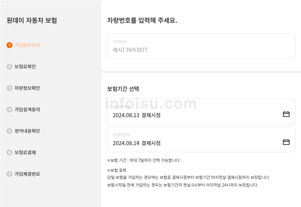 2. 운전하고자 하는 차량번호 입력 및 보험 기간 선택하여 다음으로 이동