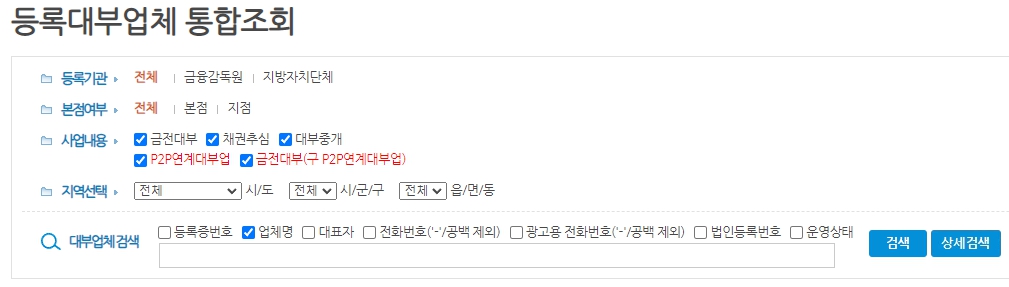 2. 상담의 금융소비자보호 > 금융회사 조회 > 등록 대부업체 통합조회