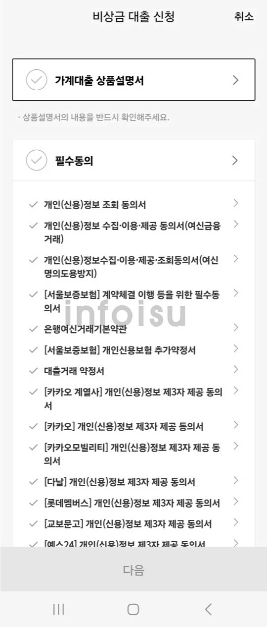 2. 이후 가계대출 상품 설명서 확인 및 필수동의 진행하여 한도 및 금리를 조회합니다.